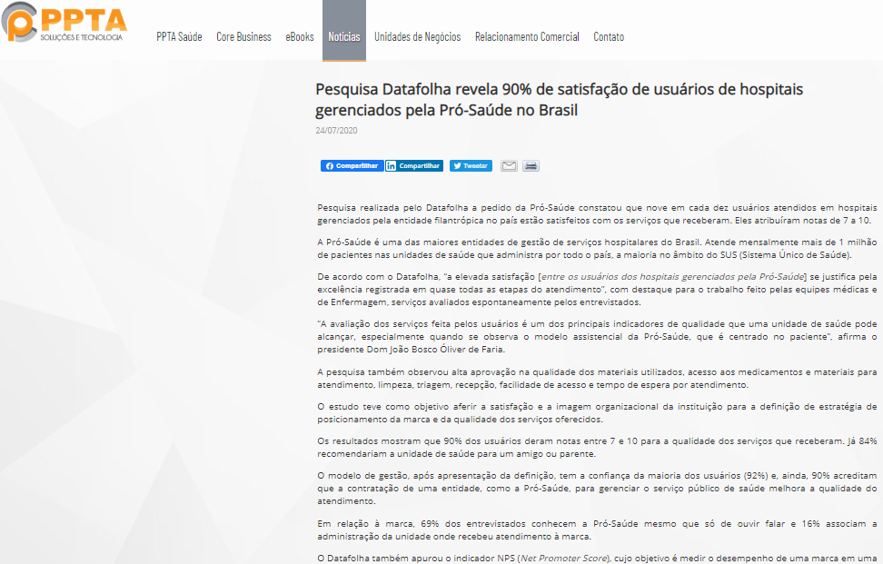 PPTA Saúde – Pesquisa Datafolha revela 90% de satisfação de pacientes em hospitais gerenciados pela Pró-Saúde no Brasil