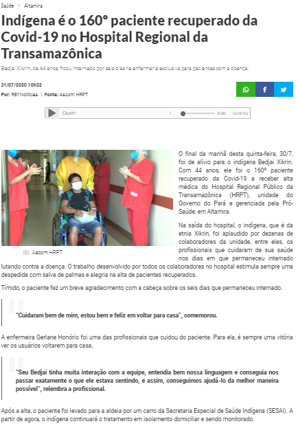 RB1 Notícias – Indígena é o 160° paciente recuperado da covid-19 no Hospital Regional da Transamazônica