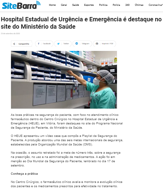 Site Barra – Segurança do paciente no Hospital Estadual de Urgência e Emergência é destaque no site do Ministério da Saúde