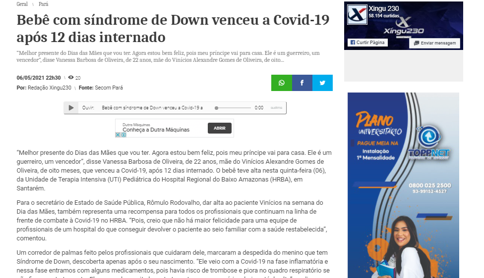 Xingu 230 – Bebê com síndrome de Down venceu a Covid-19 no Hospital Regional do Baixo Amazonas após 12 dias internado