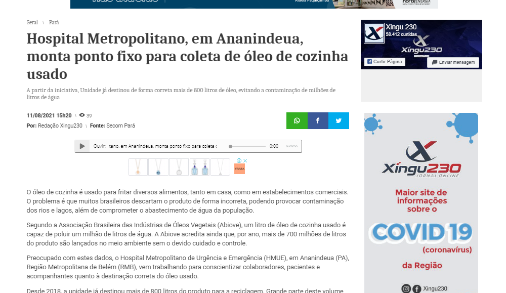 Xingu 230 – Hospital Metropolitano, em Ananindeua, monta ponto fixo para coleta de óleo de cozinha usado