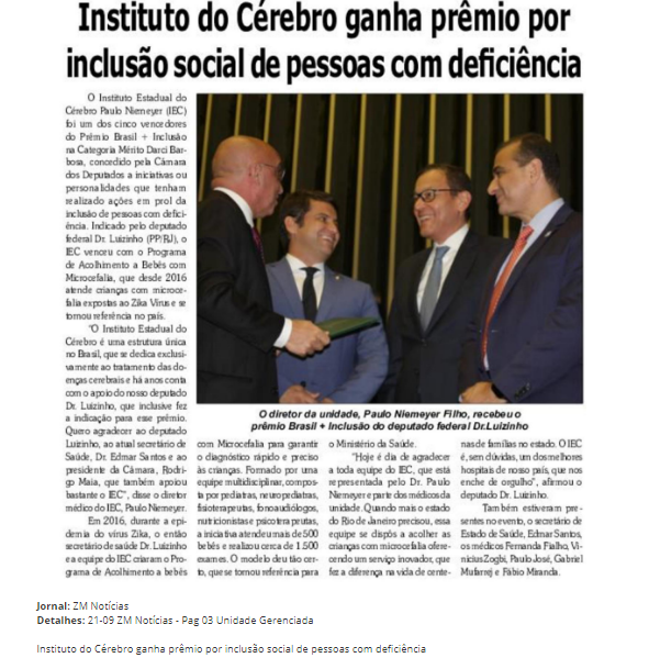ZM Notícias – Instituto Estadual do Cérebro recebe prêmio por inclusão social de pessoas com deficiência
