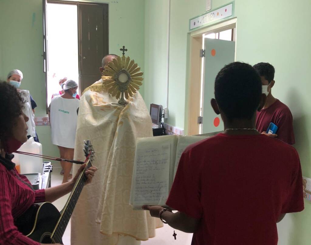 Ao som de músicas religiosas cantadas pelos colaboradores do GTH e do capelão do hospital, padre Orlando Tito Filho, o ostensório foi levado em setores, como Clínica Médica, Maternidade, UTI Adulto e neonatal e recepção, além de áreas administrativas, visitando cerca de 120 pacientes internados.