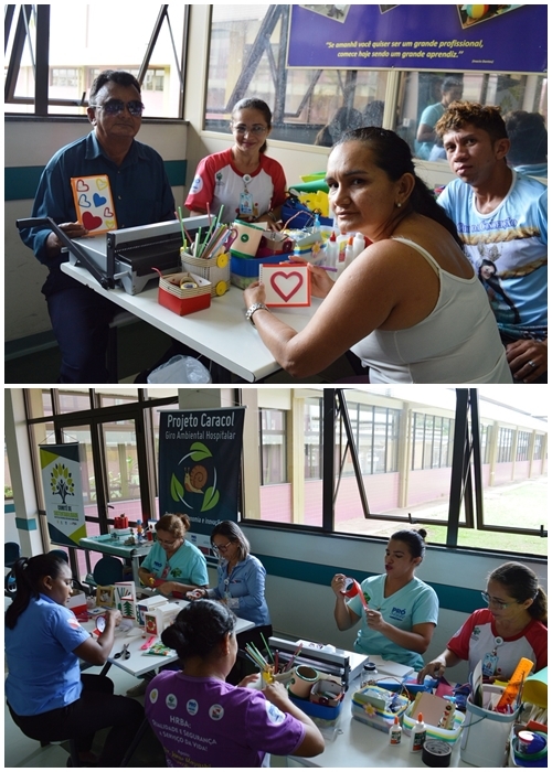 A oficina faz parte do projeto “Caracol, giro ambiental hospitalar”, que consiste no reaproveitamento de materiais usados no hospital, como tampas de medicamentos, papeis e bombonas plásticas. Ou seja, o que antes ia parar no lixo, agora ganha utilidade ou se transforma em presentes. “Como eu sou professora, esse reaproveitamento de materiais me despertou a atenção. Também é uma forma de homenagear alguém com um cartão. São coisas simples e práticas”, diz a acompanhante Maria do Socorro.