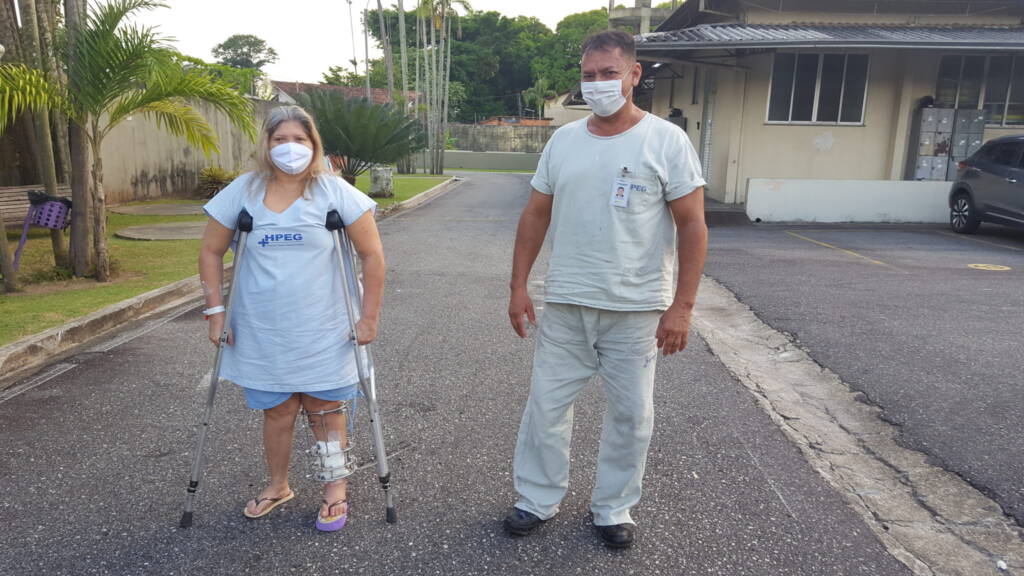 Nilzabete dos Santos sofreu um acidente de moto há 2 anos e precisou passar por um procedimento de alongamento ósseo no HPEG. Por conta da fratura, ficou com uma diferença de 4 centímetros de uma perna para outra. “Tenho esperança que essa sandália irá me ajudar no futuro. Já estou andando com ela há alguns dias e me sinto bem. Hoje já consigo caminhar pelo hospital, algo que antes não fazia”, relata a paciente que, diariamente, é acompanhada por fisioterapeutas da Unidade com exercícios que auxiliam no seu processo de recuperação.