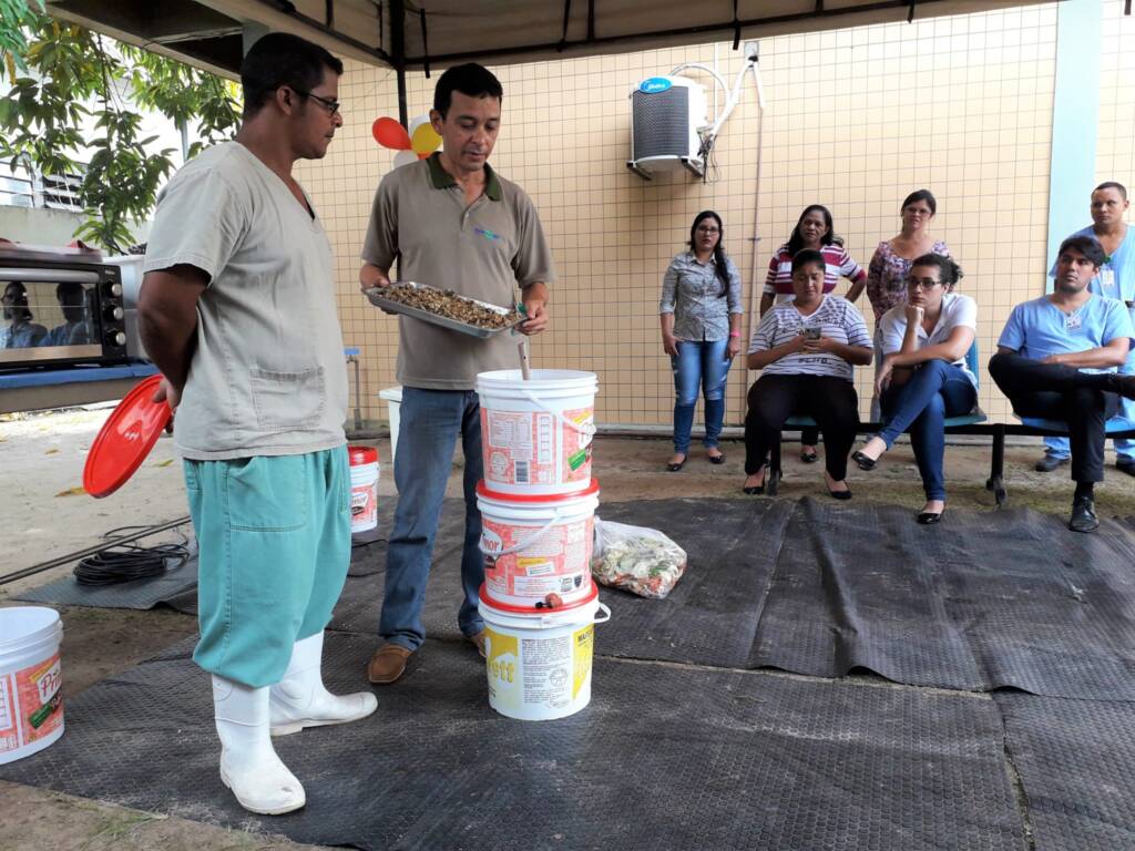 Os benefícios do aproveitamento correto de restos de alimentos foram abordados durante a Oficina de Compostagem ministrada aos funcionários do Hospital Metropolitano de Urgência e Emergência (HMUE), unidade do Governo do Estado do Pará, no dia 26 de julho. A prática, que já era aplicada para a destinação adequada aos resíduos do refeitório da Unidade, deve melhorar com a adoção de adaptações. A atividade integrou a Semana do Programa de Gerenciamento de Resíduos Sólidos de Saúde.