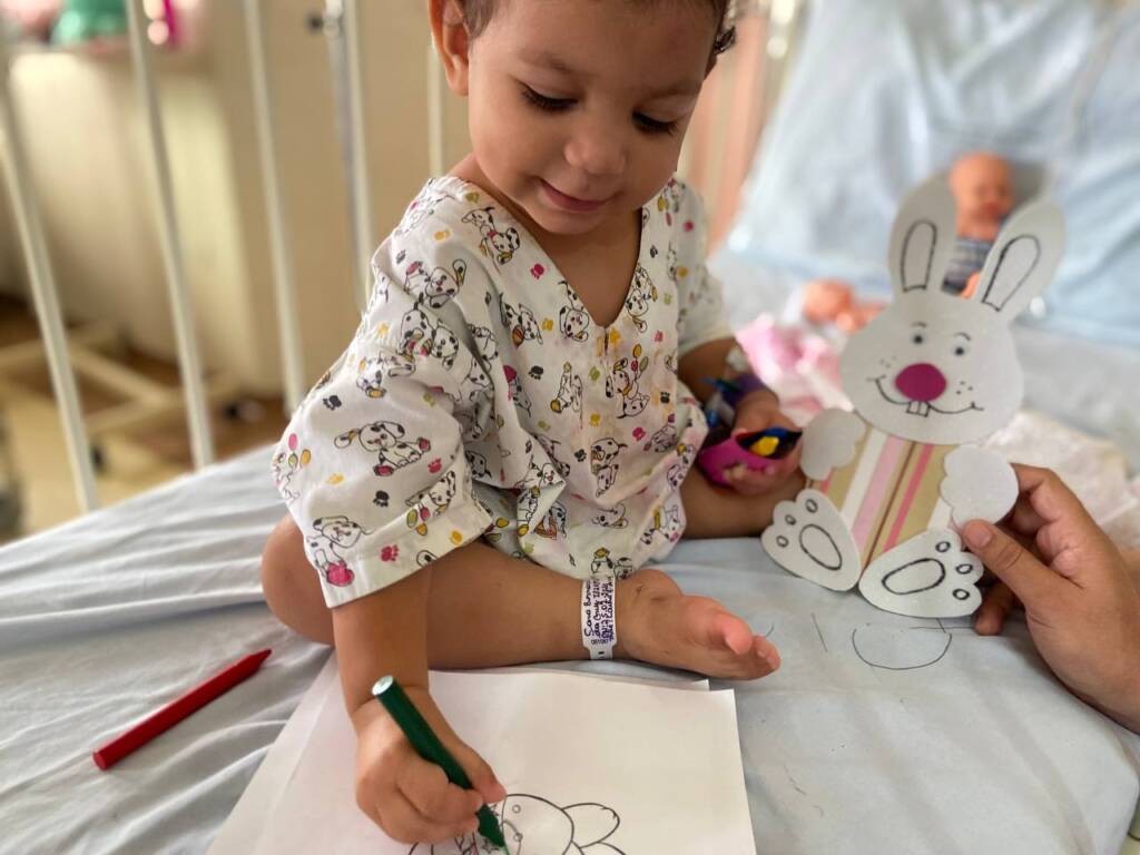 As 14 crianças internadas na Unidade de Terapia Intensiva (UTI) infantil e na enfermaria pediátrica tiveram um dia especial em alusão à Páscoa. Elas aproveitaram o momento para trocar a rotina de exames e remédios por uma manhã de diversão, com direito a brincadeiras e pintura.