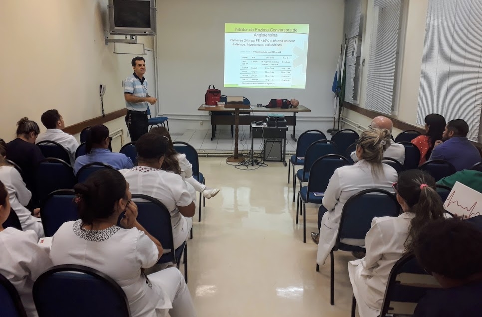 Médicos, enfermeiros e farmacêuticos do Hospital Estadual Getúlio Vargas (HEGV), no Rio de Janeiro, participaram do curso de atualização em Infarto Agudo do Miocárdio (IAM). A capacitação foi ministrada pelo médico Stephan Lachtermacher Pacheco, coordenador da Unidade Cardiointensiva Clínica do Instituto Nacional de Cardiologia (INC).