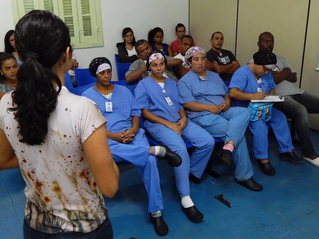 O treinamento abordou tópicos como: “Definição de Biossegurança”, “os riscos”, “vias de transmissão”, “dados de acidentes”, “precauções padrões” e ‘tipos de EPI”.