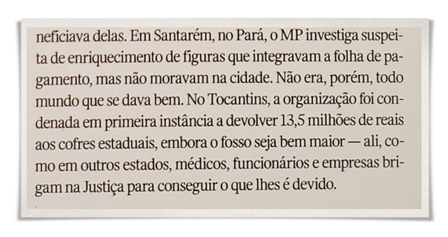 Em Tocantins, faltou VEJA informar que o questionamento feito pelo MPF, no processo 8073-74.2012.4.01.4300, refere-se ao modelo de gestão, cujo mais recente entendimento do STF reconhece sua constitucionalidade.