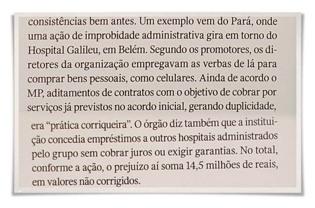 Sobre os contratos de gestão do Pará, a entidade já comprovou sua idoneidade em denúncia arquivada por falta de provas. A ação de improbidade citada está em fase inicial e não constitui prova de ilegalidade. O uso de recursos entre hospitais do mesmo Estado era transparente e de total ciência do contratante, que validava as prestações de contas mensalmente.