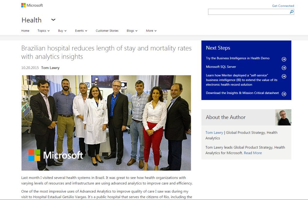 Lewry registrou em seu blog, na página da Microsoft, o quanto ficou impressionado com o trabalho desenvolvido nas UTIs do HEGV. “Foi muito inspirador ver o grandioso trabalho que é realizado neste hospital. Sua história é um grande exemplo de como esse sistema de gestão pode ter um real impacto para um melhor atendimento, mesmo em situações difíceis”, ressaltou.