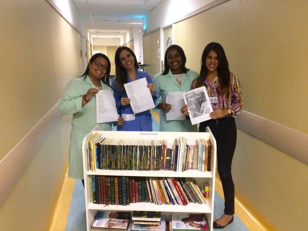 Outra ação desenvolvida foi o “Dia da Leitura”, em que colaboradores da equipe multiprofissional realizaram momentos de leitura nas enfermarias. Participaram desse trabalho a equipe de Enfermagem, assistentes sociais, fisioterapeutas, psicólogos, técnicos de Segurança do Trabalho, entre outros membros da equipe multiprofissional do Hospital Alayde Costa.