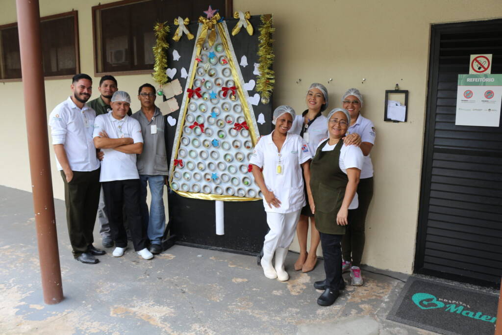 A árvore foi confeccionada pelas equipes do Serviço de Nutrição e Dietética (SND), em conjunto com a manutenção, e além de enfeitar o espaço da unidade, também é possível deixar uma mensagem de otimismo para o próximo ano, que podem ser deixadas por todos no hospital.