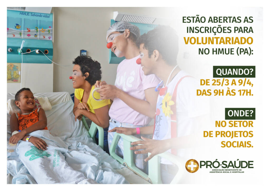 Após o período de inscrições, os voluntários cadastrados irão participar de uma ambientação para conhecer melhor o Hospital e receber orientações sobre as Políticas Institucionais da Pró-Saúde Associação Beneficente de Assistência Social e Hospitalar, entidade que gerencia o HMUE, sob contrato de gestão com a Secretaria de Estado de Saúde Pública (SESPA).
