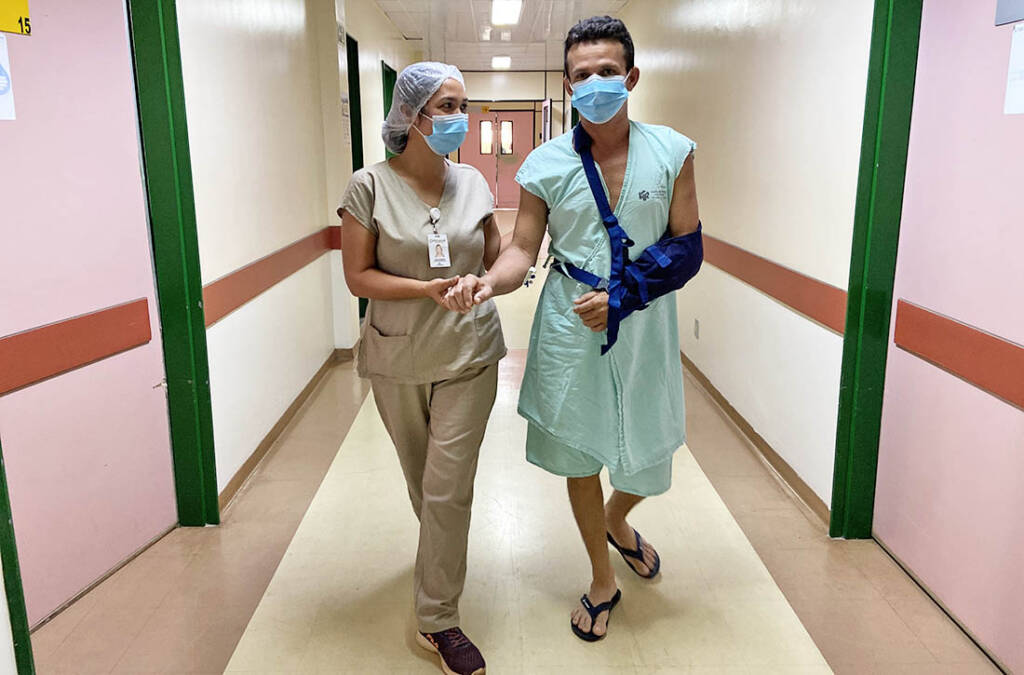 Após o procedimento e período de repouso, por orientação médica, Helton seguiu sendo acompanhado pela equipe de fisioterapia para iniciar a mobilização precoce. “No caso dele, o exercício prescrito foi a deambulação (caminhada), para evitar a perda de massa muscular ou prejuízos ao seu condicionamento físico durante o período de internação”, explica Elays.