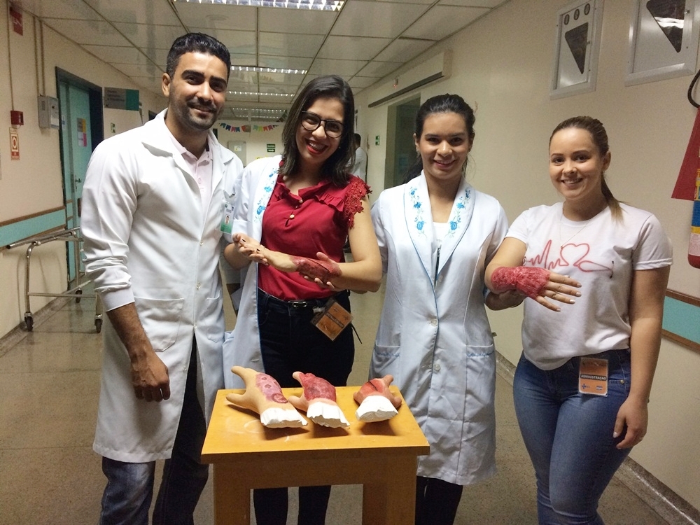 Durante o treinamento, os enfermeiros abordaram os tipos de lesões de pele mais comuns em pacientes atendidos na unidade, como queimaduras e feridas provocadas por acidentes automobilísticos. A demonstração contou com o apoio de estudantes do curso de Enfermagem da Faculdade Metropolitana, que utilizaram maquiagem para simular os aspectos das lesões no próprio braço e em mãos de gesso.