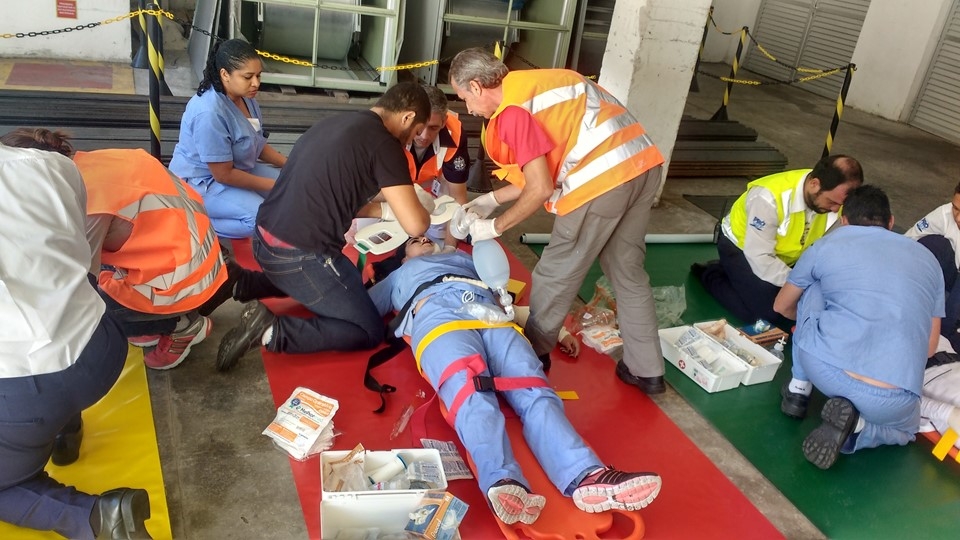 Como parte do treino, os brigadistas tinham a função de transferir as vítimas para um local mais seguro, realizar os primeiros socorros e extinguir o princípio de incêndio, simbolizado por imagens de fogo.