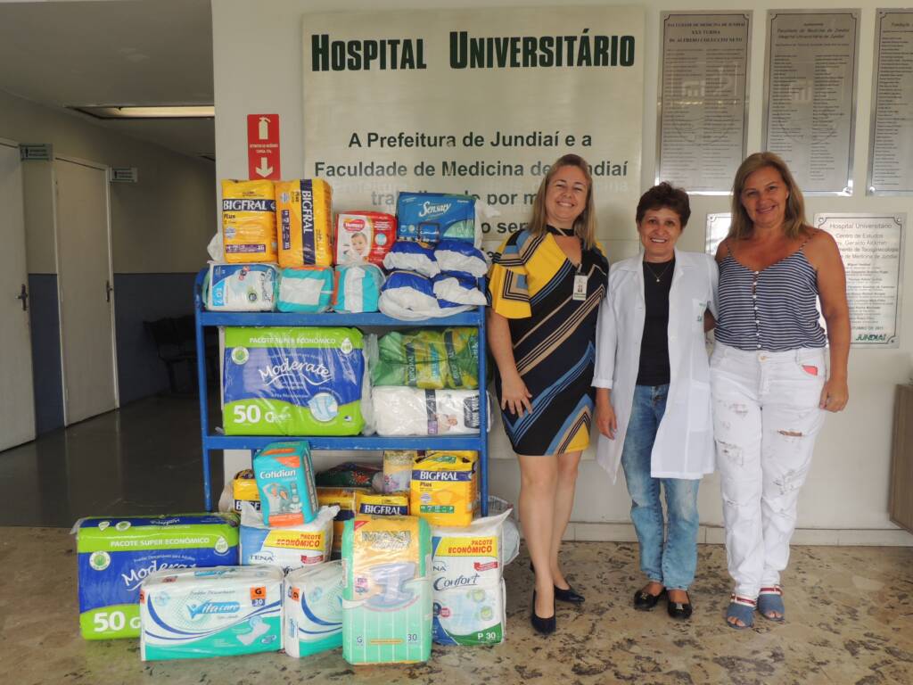 Cerca de 690 fraldas geriátricas foram doadas ao Hospital Universitário (HU), de Jundiaí (SP), pelo grupo Encontro de Casais com Cristo (ECC), que faz parte da Paróquia Nossa Senhora do Desterro. As doações foram entregues por Patrícia Nivoloni, que por 13 anos esteve à frente da equipe de voluntários do HU, e foram recebidas por Tatiane Keller, atual coordenadora do Voluntariado, e Ginete de Lucena, responsável pelo Serviço de Atendimento ao Cliente (SAC).