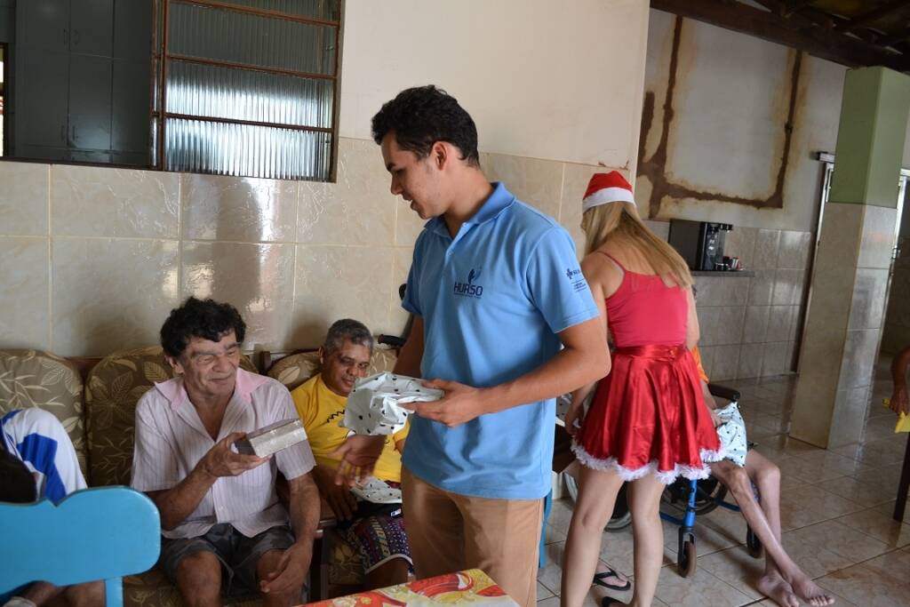 Todos os idosos receberam um presente em mãos dado pela psicóloga Emanueli Sperandio (vestida de mamãe noel) e pelo servidor do Departamento Pessoal, Cássio Ramos. Os presentes foram doados à Comissão por meio de uma campanha feita por um grupo de amigos de Santa Helena de Goiás, pelo projeto “Um Real, Um Natal”. Já o lanche, foi produzido pela própria Comissão que doou os ingredientes. A presidente da Comissão e fisioterapeuta Pollyanna Regina lembra que há muitos anos que o Hurso realiza ações com os da melhor idade no abrigo, e que este ano não poderia ser diferente. “Para a árvore fraterna do Natal estamos arrecadando materiais para os usuários do hospital, mas com a ajuda do grupo de amigos do Cássio pudemos realizar mais uma vez o Natal para os vovôs”. A felicidade nas palavras de agradecimentos e sorrisos no rosto de cada vovô e vovó foi a maior recompensa que poderia ter sido ganha foram as palavras ditas por Cássio ao final da Ação.