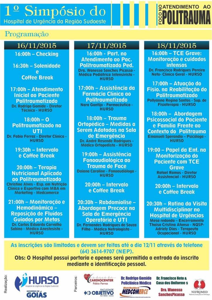 Ao longo dos dias 16, 17 e 18 de novembro o Hospital de Urgências da Região Sudoeste (Hurso) realizou o 1º Simpósio com Foco no Atendimento ao Politrauma. O objetivo da ação foi gerar um diálogo entre todas as áreas envolvidas no tratamento do paciente politraumatizado. “Apesar de ter sido o primeiro, já tivemos excedente de inscrições e todos que participaram elogiaram”, comentou o diretor Técnico, Rodrigo Gomide. Além da área médica e enfermagem, ainda aconteceram palestras sobre fisioterapia, psicologia, nutrição e fonoaudiologia.
