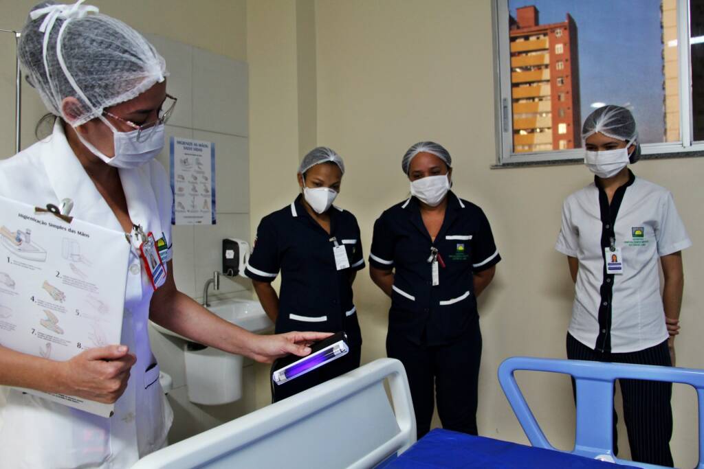 Para afastar esse risco, a unidade gerenciada pela Pró-Saúde Associação Beneficente de Assistência Social e Hospitalar, após a limpeza dos leitos de internação, utiliza uma técnica que quando aplicado um gel simulador de bactérias em pontos específicos identifica a eficácia da limpeza com luz ultravioleta.