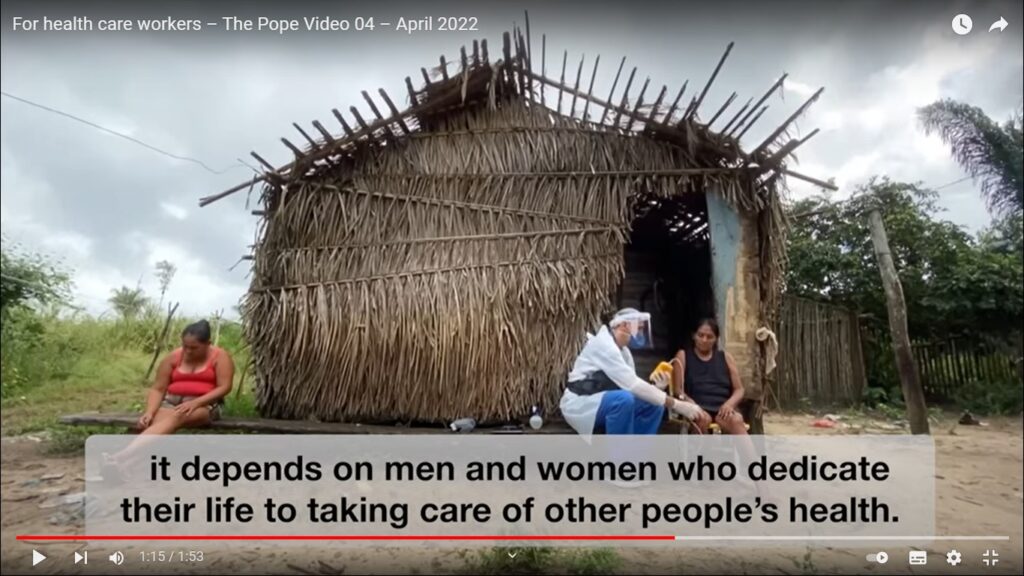 As imagens dão projeção internacional ao trabalho de inúmeros profissionais de saúde no enfrentamento da pandemia de Covid-19 no mundo. Por volta de 1min08s, aparece o neurocirurgião em atuação contínua nas tribos indígenas da região. Na mensagem, o papa explica: “Rezamos pelos profissionais de saúde que atendem doentes e idosos, especialmente nos países mais pobres; que eles sejam adequadamente apoiados pelos governos e comunidades locais”.