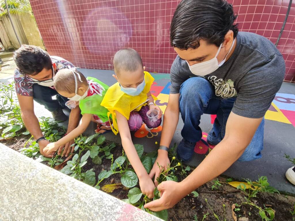 Na horta são cultivadas Plantas Comestíveis Não Convencionais (PANCs) e praticadas atividades de ensino-aprendizagem com participação de crianças e adolescentes que estudam na Classe Hospitalar Prof. Roberto França.