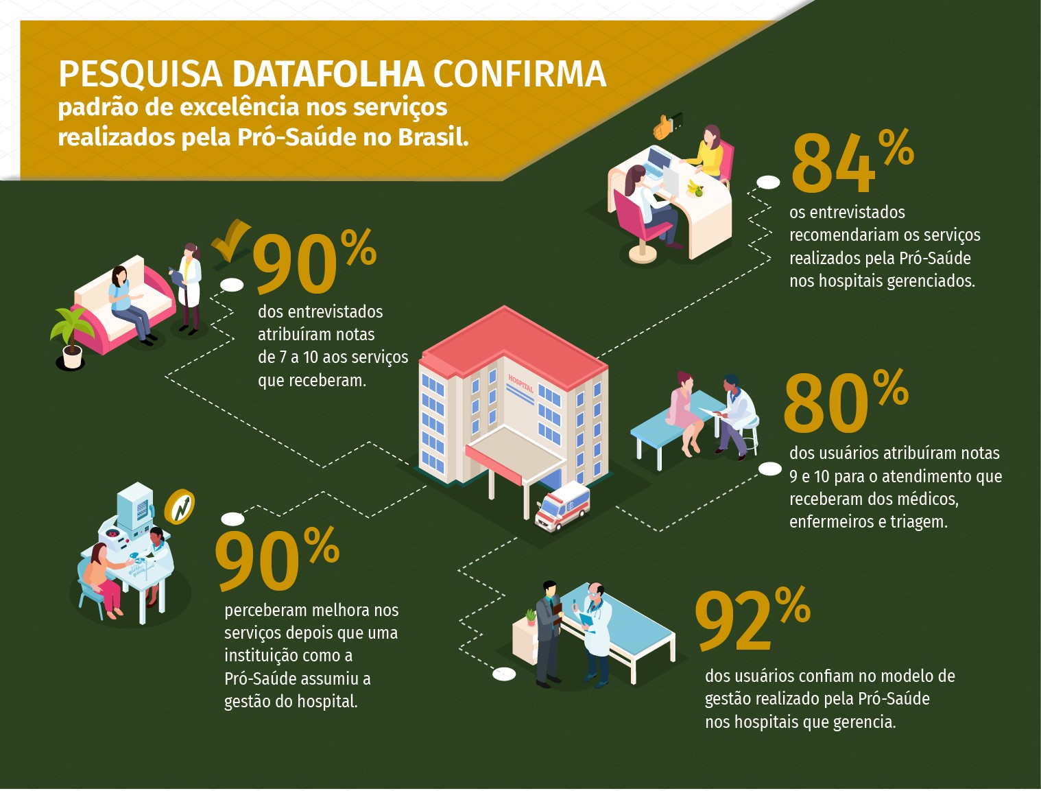 Pesquisa realizada pelo Datafolha a pedido da Pró-Saúde constatou que nove em cada dez usuários atendidos em hospitais gerenciados pela entidade filantrópica no país estão satisfeitos com os serviços que receberam. Eles atribuíram notas de 7 a 10.