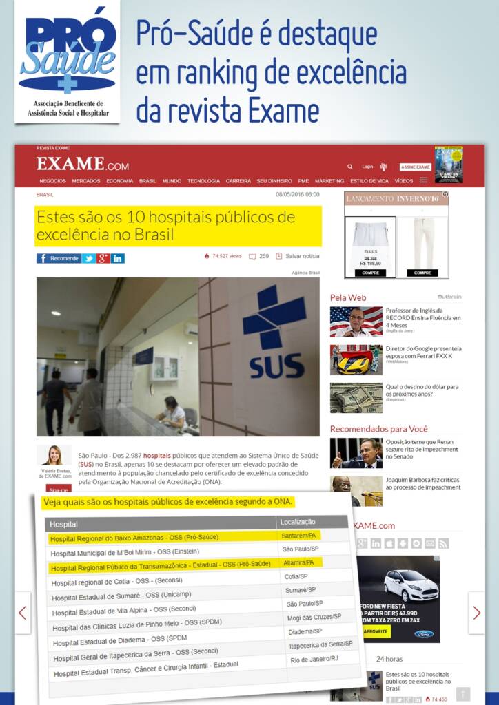 Ranking publicado pela revista Exame, uma das mais importantes do País, mostra que dois hospitais administrados pela Pró-Saúde estão entre os dez que atendem ao Sistema Único de Saúde (SUS) se destacando pelo elevado padrão de atendimento à população brasileira.
