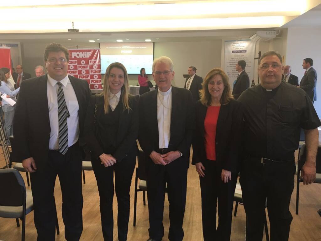 Ao centro, dom Leonardo Ulrich Steiner, secretário Geral da CNBB, os advogados Ricardo Salvador e Wanessa Portugal (esquerda), a gerente de Filantropia da Pró-Saúde, Regina Victorino, e o vice-presidente da Pró-Saúde, dom Hugo da Silva Cavalcante (direita)