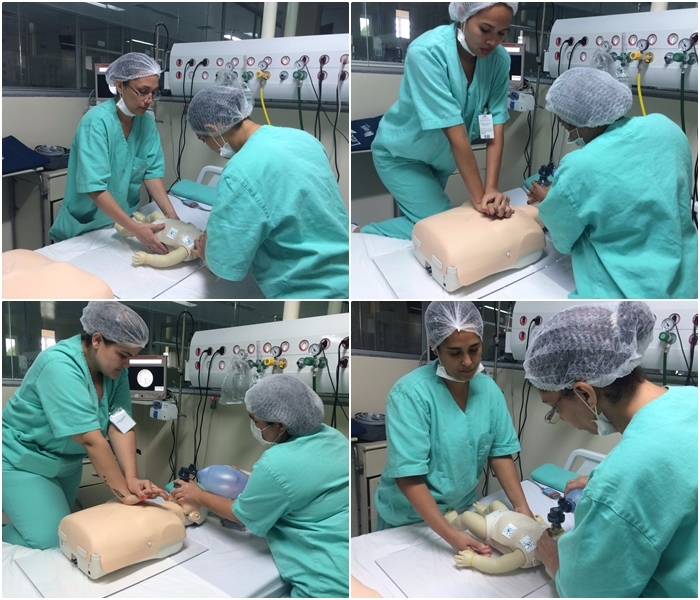 Com o auxílio de três bonecos de diferentes tamanhos, desde o recém-nascido até o tamanho adulto, a equipe recebeu orientações quanto as manobras de reanimação cardíaca e respiratória e ainda sobre as medicações a serem administradas durante o procedimento.