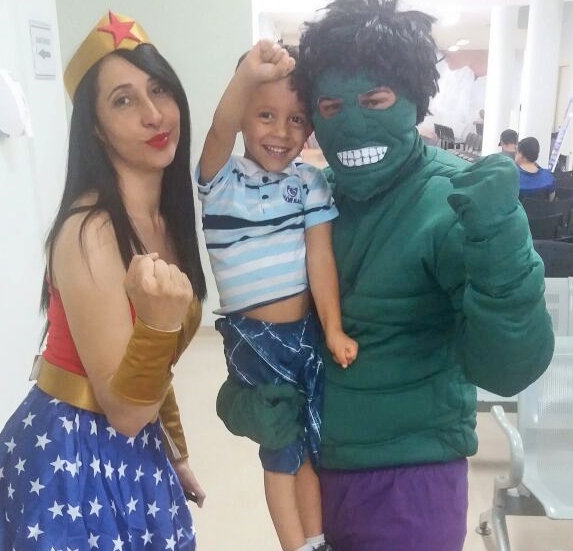 Em outubro passado, no Dia da Criança, voluntários se caracterizaram de super-heróis Incrível Hulk e Mulher Maravilha e animaram a garotada que estava sendo atendida na unidade.