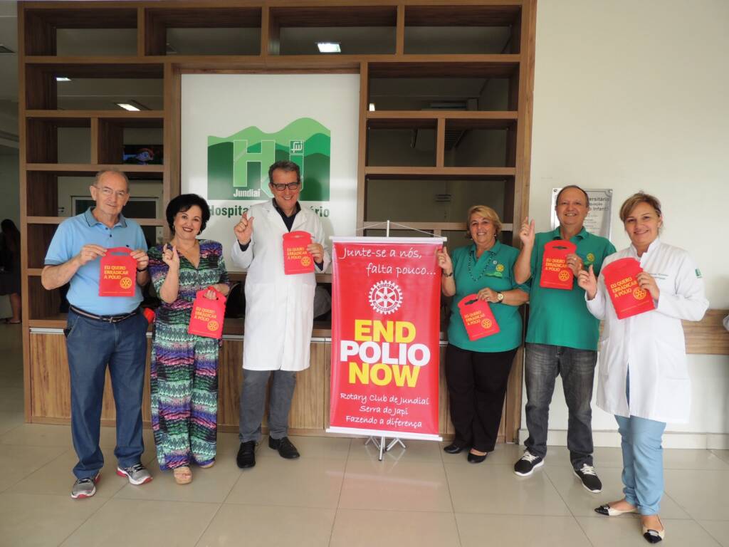 Na manhã desta segunda-feira, dia 30/10, os membros do Rotary Club Jundiaí – Serra do Japy estiveram no Hospital Universitário (HU) de Jundiaí (SP) para promover a campanha “Eu quero erradicar a pólio”. De acordo com Jussania Rita Lamarca Escapin, que é presidente do Rotary Serra do Japy, a ação é realizada, simultaneamente, em todo o mundo. “O Rotary faz um trabalho de erradicação mundial da pólio e por esta razão, todo mês de outubro é dedicado a essa causa”, relata. Todos os pacientes e seus acompanhantes receberam sacolinhas de TNT para serem colocados em carros ou levados na bolsa com a logomarca da campanha.