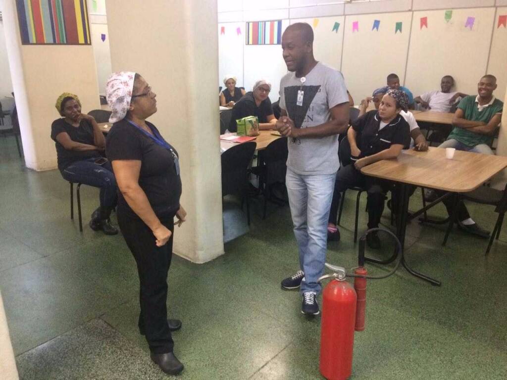 O SESMT também promoveu o treinamento “Combate a Princípio de Incêndio”, destinado às equipes de Manutenção e Cozinha. Os colaboradores receberam instruções sobre os diferentes tipos de extintores para cada tipo de incêndio. Após a explicação teórica, houve uma demonstração prática do uso correto do extintor.