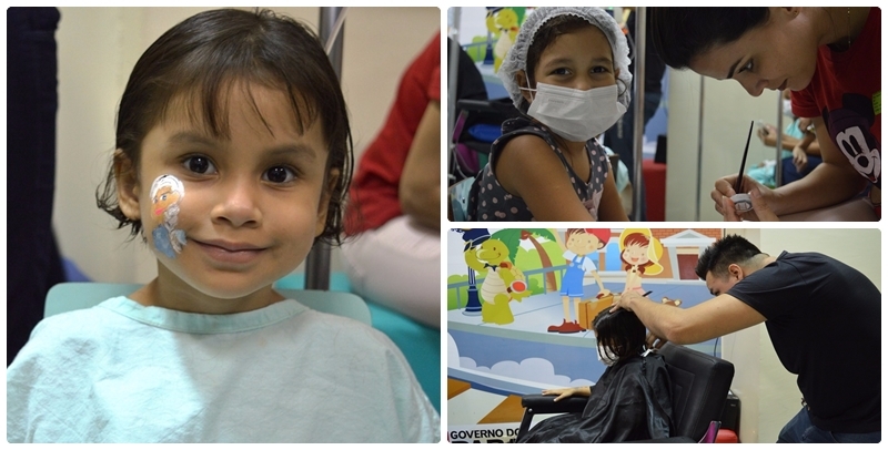 Há três anos e meio M.V., de seis anos, luta contra a leucemia no Hospital Regional do Baixo Amazonas (HRBA). Ela e a mãe saíram de Altamira para tratar da doença em Santarém. Esse tempo todo não tem sido fácil, mas as duas encontram forças para seguir em frente sem desanimar. E a equipe do hospital, junto com parceiros e voluntários, tem tentado tornar o dia a dia dos usuários mais alegre e confortável. Como nesta segunda-feira, 10/10, em que a unidade começou com a programação da “Semana da Criança no HRBA”, oferecendo corte de cabelos e pinturas corporais. “Com certeza isso ajuda muito no tratamento, tira o ar de sofrimento, não fica mais chorando. Mexe na autoestima dela, fica bem melhor, mais alegre. Ela amou o resultado”, conta a mãe, Ana Maria.