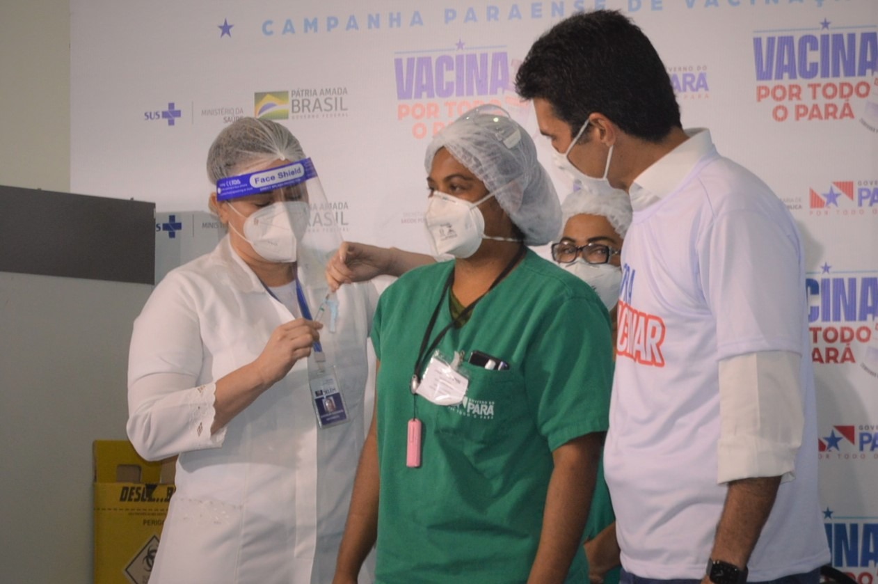 As vacinações aconteceram após a coletiva de imprensa e contou com a presença do governador Helder Barbalho e outras autoridades.