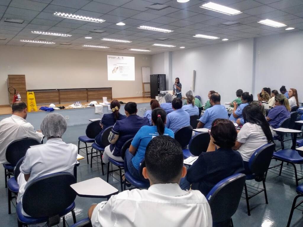 Durante o treinamento, a técnica demonstrou, entre outras coisas, a forma correta de usar os equipamentos como o respirador, utilizado normalmente pela equipe da enfermagem e manutenção do hospital.