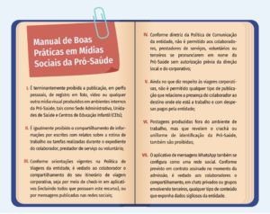 Os itens a seguir destacados, extraídos do Manual de Boas Práticas em Mídias Sociais da Pró-Saúde são as bases para a manutenção da relação harmônica entre empregado e empregador, e da atuação em conformidade com as diretrizes da Entidade, confira: