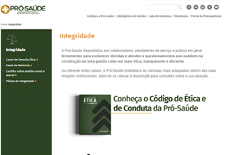 No site da Pró-Saúde, disponibilizamos o acesso ao Código de Ética e de Conduta, documento para os colaboradores e todos que se relacionam com a instituição. Outros materiais também podem ser acessados, como: cartilha sobre Assédio Moral e Sexual e os conteúdos das Pílulas de Integridade.